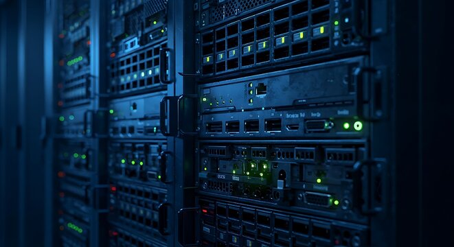 A close-up view of dark server racks illuminated by blue LED lights, showcasing the advanced technology present in a modern data center.