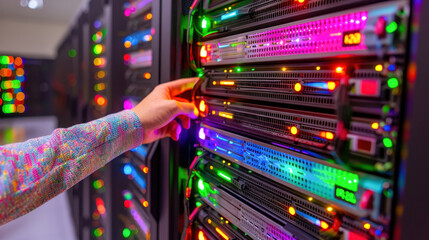 Person managing server rack in data center. High-tech infrastructure with colorful LED lights. Technology and network concept.