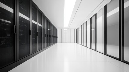 Server Room Corridor:  A minimalist and sleek server room corridor, with rows of sleek server racks and a bright, open doorway at the end, representing a gateway to a world of data, technology.