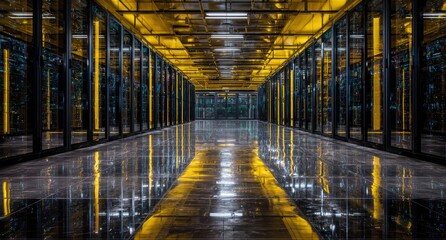 Modern Data Center Server Room with Rows of Rack Servers and Bright Neon Lighting