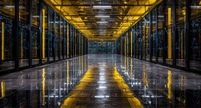 High-tech server room showcasing cloud computing, digital security, and software solutions for online storage, backup systems, and data integration, Generative AI