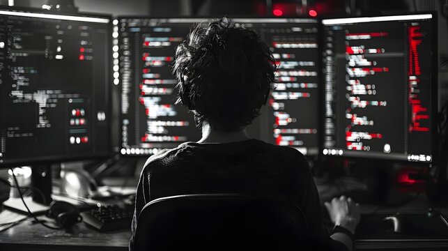 Woman sits engrossed before network of screens eyes reflecting intricate web of technology amidst dark room focus is unyielding navigates vast expanse of cyberspace