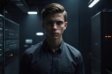 a young person inspecting a server room while holding a tablet, focused on the technology around them, with a contemplative expression
