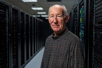 The Tech Architect at Work: A close-up shot of a tech architect smiling with a friendly expression. The tech architect holds a laptop and stands in the server room, full of advanced tech.