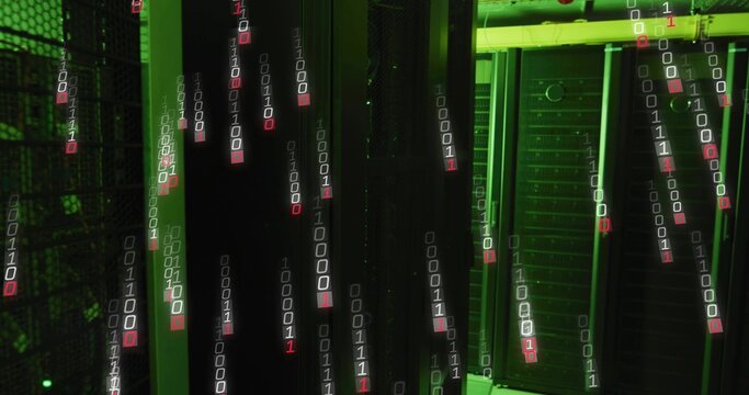 Bathing server racks in green light in server room showing vented doors, cables, falling binary