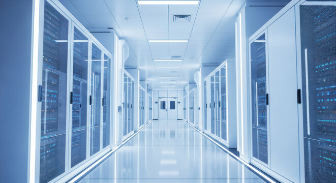 Ultra quality image of modern data center with rows of server racks in a clean, brightly lit environment. The image showcases advanced technology and infrastructure for data storage.