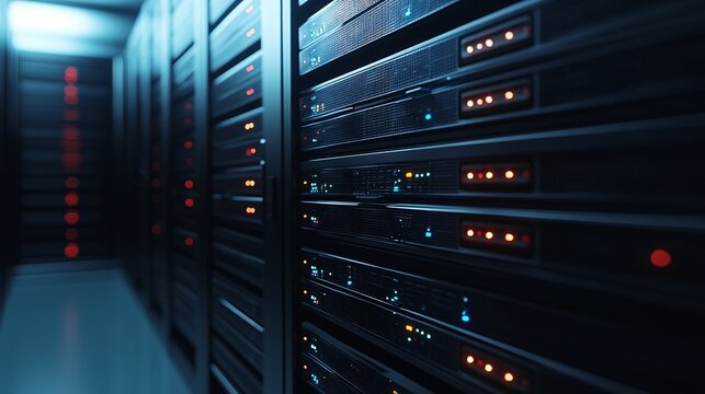 A close-up futuristic shot of server racks inside a data center, captured from a side angle with shallow depth of field.