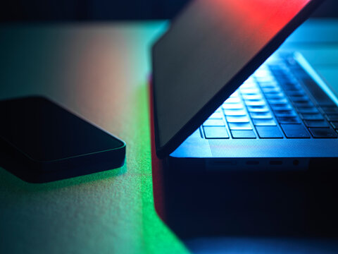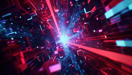 Abstract background with red and blue rays of light shining through cubical elements, creating an atmosphere of digital technology or futuristic space exploration.