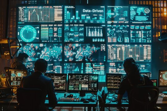 Team of Professional Computer Data Science Engineers Work on Desktops with Screens Showing Charts, Graphs, Infographics, Technical Neural Data and Statistics. Low Key Control and Monitoring Room.