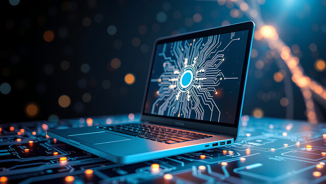 Futuristic illustration about computer technology with a laptop in neon colors. For cover backgrounds, wallpapers and other projects.
