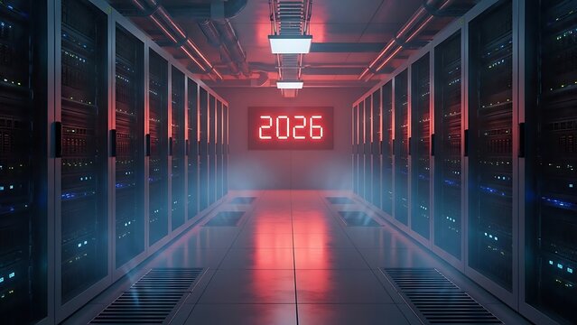 Futuristic server room with neon lights and digital display showing 2026 date in a dark and moody atmosphere
