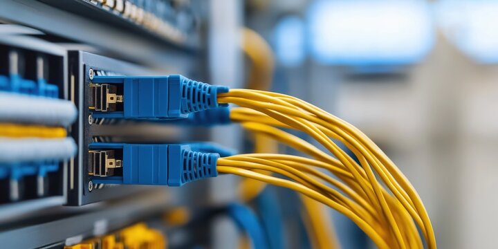 Bright yellow data cables connect to server units in a well-organized network setup indicating data transfer.