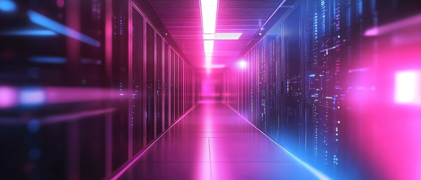 Modern Server Room with Rows of Racks and Futuristic Lighting.