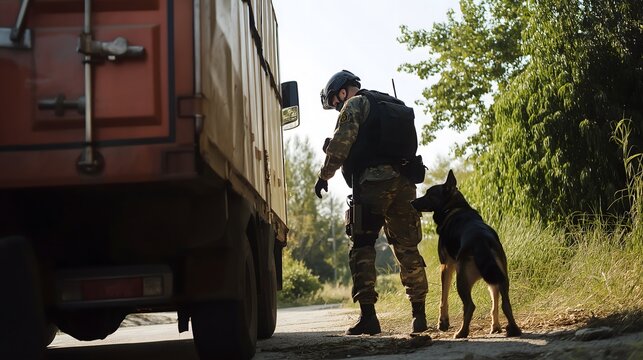 Professional security officer with trained canine conducting thorough inspection of cargo container, protective service and detection work in industrial transportation setting