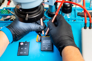 Craftsman in rubber gloves repair or service a mobile phone on a special rubber mat for repair. view from the inside