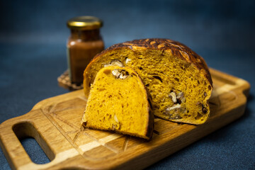 Pumpkin bread on the wooden serving board