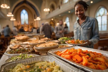 Church feast features a smiling woman serving buffet food indoors. Great image to promote faith-based events, giving and community.