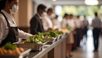 Woman in face mask serving fresh green salad at a buffet blurred businesspeople in background