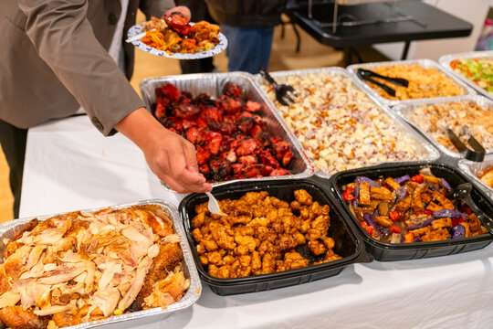 A cafeteria staff member wearing a hairnet and gloves as they serve food on a buffet line