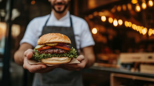 Waiter serving a freshly prepared burger to an outdoor summer dining area at a cozy street cafe, showcasing fast food dining experience in a relaxed urban setting with warm ambiance