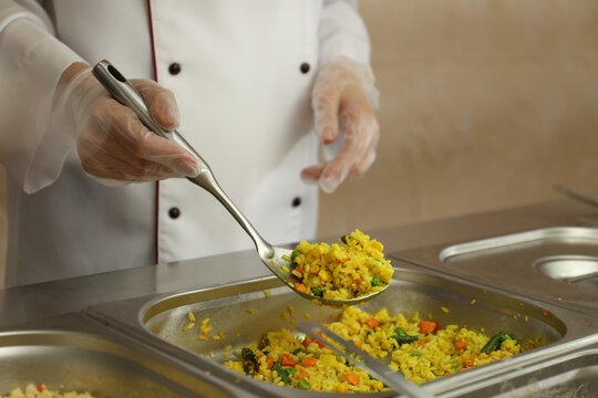 Waiter serving in motion on duty in restaurant. The waiter carries dishes.