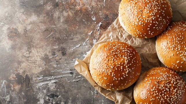Homemade burger buns with sesame seeds. Blank area for text.