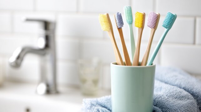 Colorful toothbrushes standing in cup on bathroom counter. Soft light and pastel tones creating fresh, clean setting for daily oral hygiene and family dental care
