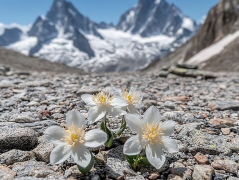 Delicate white flowers bloom in a rocky mountain landscape setting