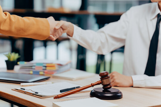 Agreement in the Courtroom: A close-up shot captures a moment of legal synergy as hands clasp in a firm handshake. A gavel lies on a table beside documents. signifying the formal closure of agreement.