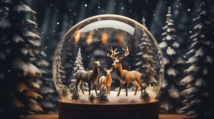 Forest-themed snow globe with deer amidst pine trees, settling snow and twinkling lights in the background