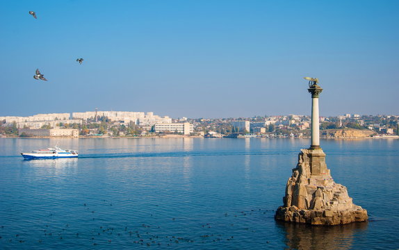 Monument to the Scuttled Ships in Sevastopol. The inscription reads In memory of the ships sunk in 1854-1855 to block the entrance to the raid