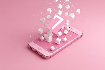 Pink smartphone screen displays a floating pink number 7 amongst falling white cubes