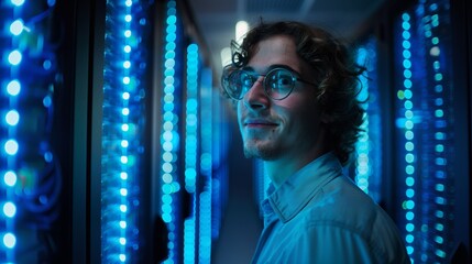 A man with glasses is standing in front of a blue wall with many lights in a modern sever room