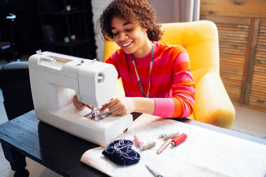Young African woman working at sewing machine. Charming black girl in red sweater