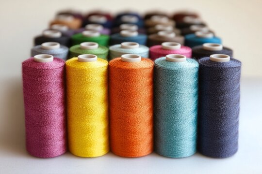 Colorful spools of thread arranged neatly in two rows showcasing a variety of shades suitable for creative sewing projects