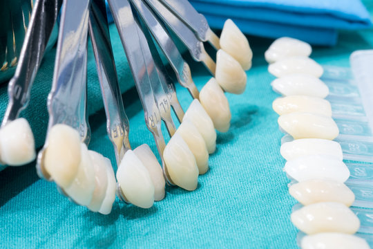Close up shade guide for check color of tooth crown in clinic.