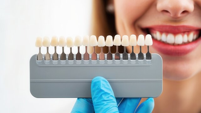 Teeth whitening and quality assurance using a shade guide for an ideal bright smile and lip whitening, alongside color assessment for artificial dental crowns and veneers in oral care and dentistry.