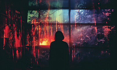 Realistic indoor color photo of an immersive art installation showing projections of trees in spring bloom, volumetric lighting, light and shadow. From the series �Imaginary Museums.�