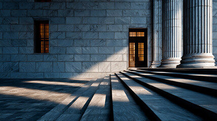 Courthouse facade shadow band pattern with rhythmic light contrast, monumental exterior architecture texture conveying authority, civic presence, and legal tradition
