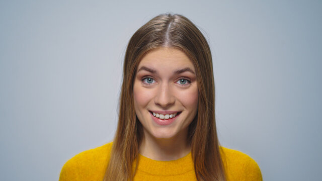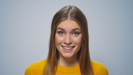 Studio portrait of displeased girl shaking head and saying no. Denial sign