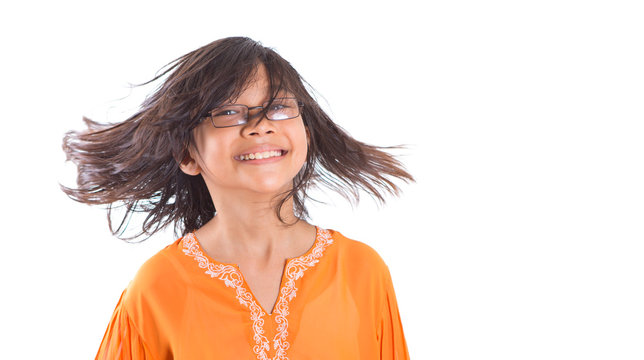 woman wearing jeans and a jacket is shaking her head with her hair. The concept of joy, happiness, joy, fun