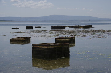 Oyster Farming pots in Sligo Bay, Blackrock Lighthouse in background