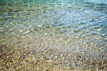 Ripples of the crystal clear shallow water surface, on a stony beach of Lake outdoor summer backgrounds.