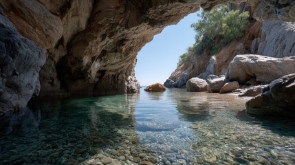 Flowing crystal-clear pool revealing submerged stones in moss-covered forest gorge