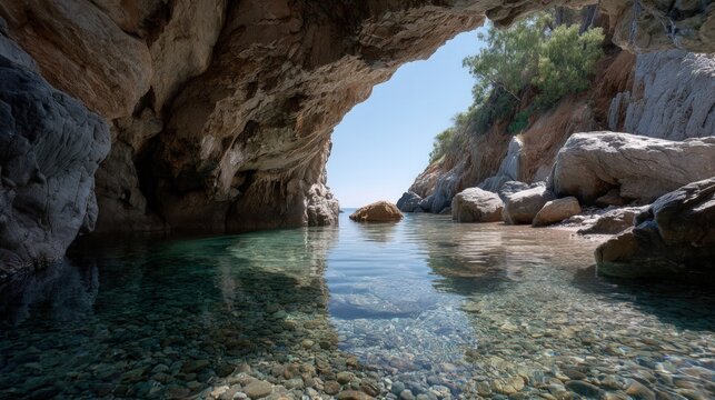 Serene sunrise over a tranquil beach.  Clear water pools reflect a vibrant sunrise sky.  Pebbly beach foreground