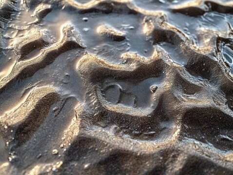 Close-up of wet sandy surface with ridges and shallow water pools reflecting light