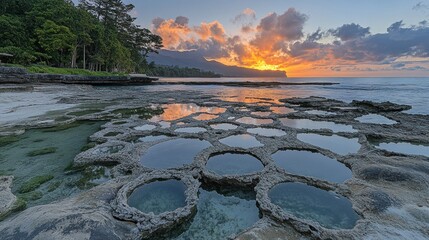 Sunset over a rocky beach with smooth stones and reflections in shallow water pools at dusk time