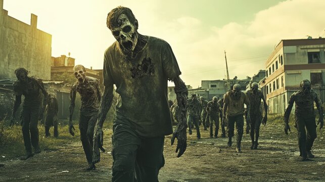 A menacing crowd of the undead shambles through an abandoned urban landscape during a zombie apocalypse