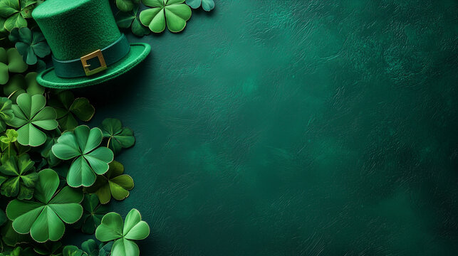 Green background with shamrocks and leprechaun hat for Saint Patrick's Day