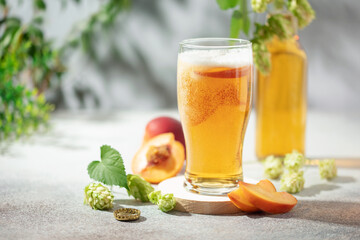 Boozy Refresing Cold Hard Peach Cider or Craft Fruit Beer in a Pint Glass on wooden table. Copy space